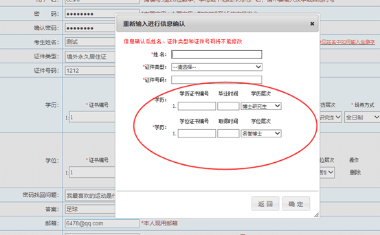 ? ? ? ?填寫完畢確認無誤后點擊【提交】,出現(xiàn)信息確認,需要考生重新輸入姓名、證件類型、證件類別、證件號碼、學歷、學位信息進行二次確認。如下圖所示: