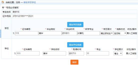 在頁面中根據(jù)需要,添加學歷或?qū)W位信息,添加完成后,點擊【保存】按鈕,完成學歷學位的修改。