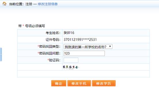 進入修改注冊信息界面,可修改密碼找回問題以及修改手機號和學歷信息,如圖