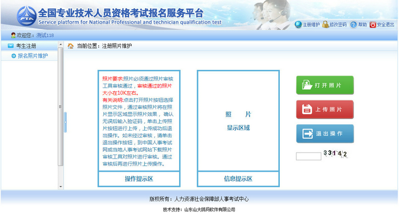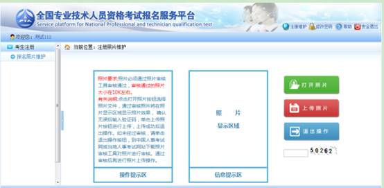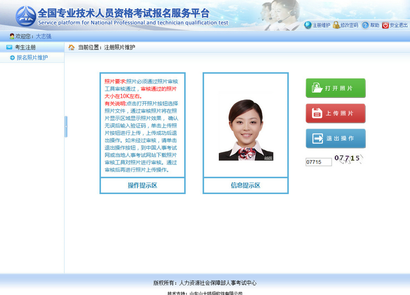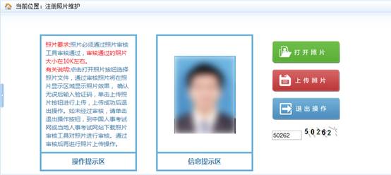 ? ? ? ?照片上傳成功后不允許修改照片。如有特殊原因,必須對上傳的照片進行修改,請選擇要報考的考試,然后聯(lián)系所報考省、市人事考試中心(各省電話鏈接:各省咨詢電話),提出修改申請,由考試中心工作人員對申請信息進行審核,允許修改的考生重新登錄報名系統(tǒng),進入【注冊照片維護】界面(如下圖)。 ? ? ? ?進入照片維護頁面,點擊【打開照片】按鈕,選擇經(jīng)過【照片審核】工具處理過的照片,照片會顯示在信息提示區(qū),輸入驗證碼,點擊【上傳照片】按鈕,彈出提示框,選擇【確定】按鈕,照片上傳成功(見下圖)。