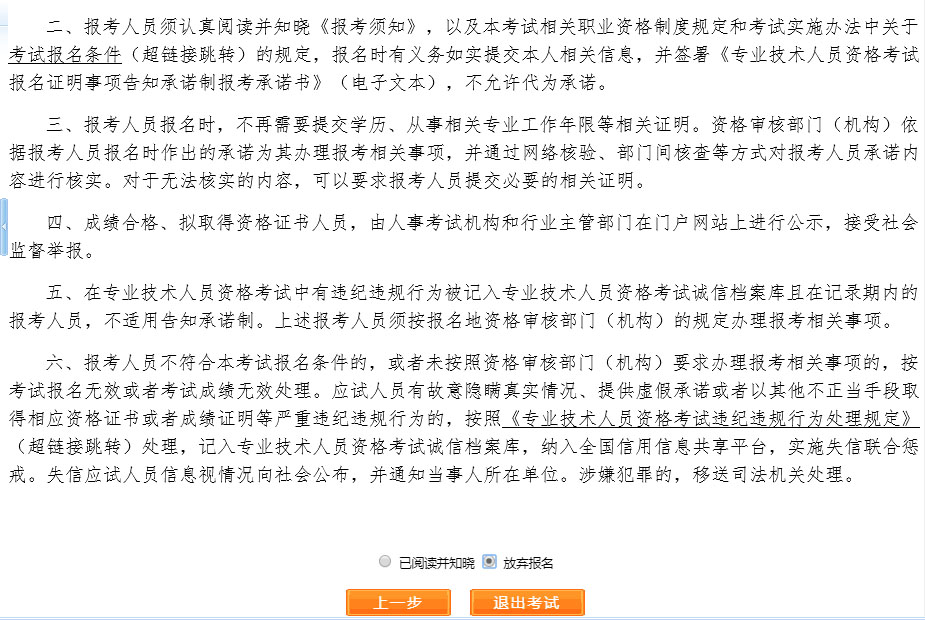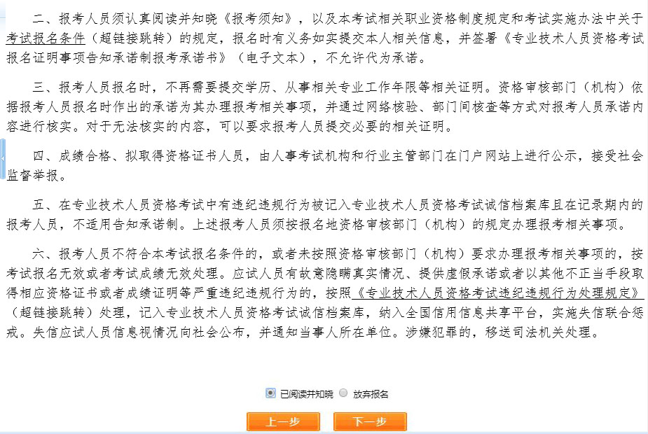 ? ? ? ?選擇報名省份,點擊【下一步】,顯示【專業(yè)技術(shù)人員資格考試報名證明事項告知承諾制告知書】,如圖。閱讀完畢后,選中【我已閱知并同意】,點擊【下一步】,可進入報考須知。若考生不想報名,點擊【放棄報名】,退出該考試報名。
