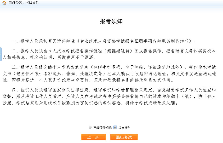 重點提示:報考須知為報考人員必須閱讀并了解的重要事項,請報考人員務必認真閱讀。若考生不想報名,點擊【放棄報名】,退出該考試報名。
