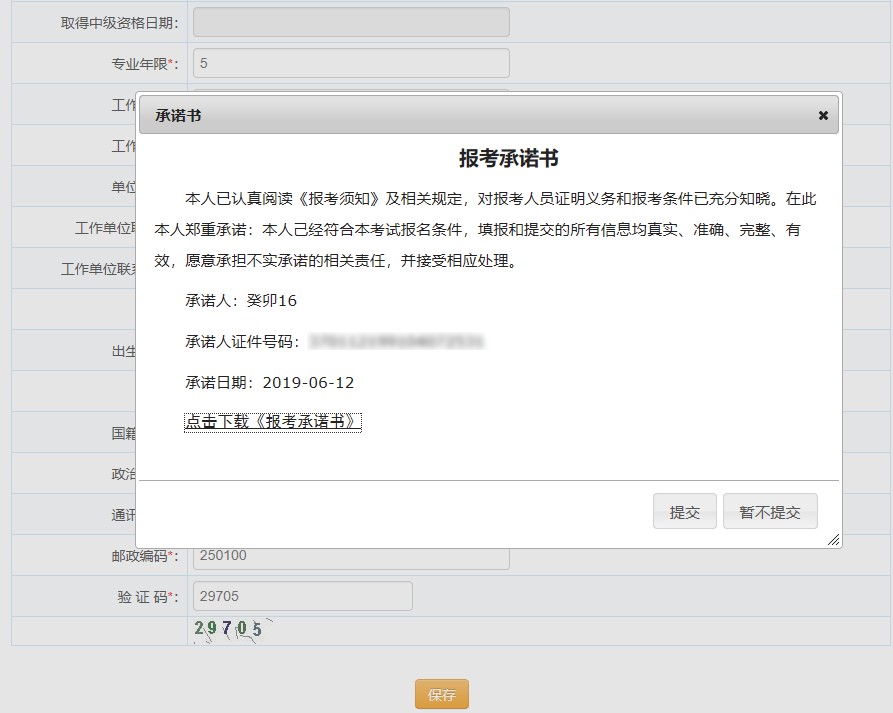 1) 若為正常報名考生,點擊【保存】,彈出簽訂報考承諾書頁面: