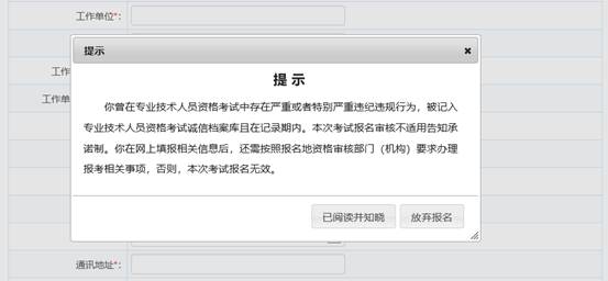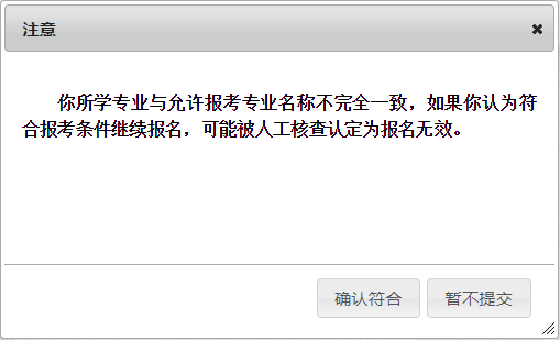 報名信息確認時,系統(tǒng)對考生所填寫的學歷專業(yè)與選擇的可報考專業(yè)進行校驗,若所填專業(yè)與報考條件所列專業(yè)不符,則彈出以下提示頁面: