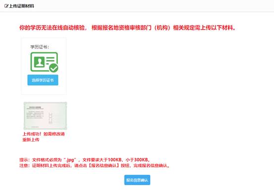 若考生的學歷、學位信息不在自動核驗的范圍內(nèi),考生須上傳與身份、學歷、學位一致的證明信息。上傳頁面如圖: