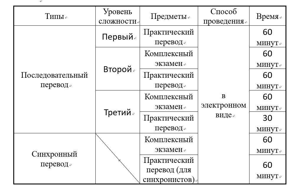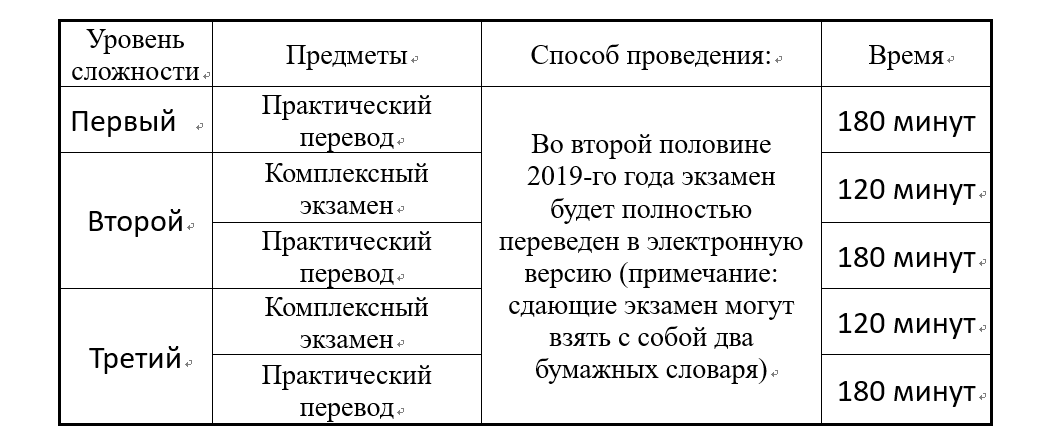 Комплексный экзамен определяет базовый уровень знаний, в том числе словарный запас и знание грамматики, способность понимать прочитанное и понимание на слух, способность заполнять пробелы в текстах и т.д.; практический экзамен проверяет способность сделать перевод и состоит из перевода текстов с иностранного на китайский язык и перевода с китайского языка на иностранный.