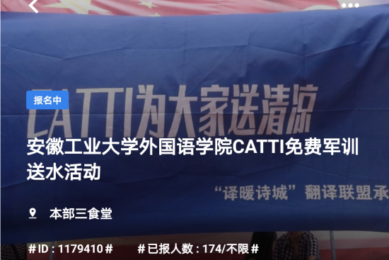 安徽工業(yè)大學(xué)9月初在校內(nèi)對全體大一新生進(jìn)行了為期約9天的軍訓(xùn)。在此期間,全體新生(除不在同一體育場學(xué)生外)齊聚學(xué)校主體育場。為了讓更多的工大學(xué)子了解CATTI考試,喚醒同學(xué)們對英語和翻譯學(xué)習(xí)的興趣,積極為想要鍛煉自己翻譯水平的同學(xué),提供一個(gè)良好的學(xué)習(xí)平臺,安徽工業(yè)大學(xué)CATTI考試校園志愿者陸一航和陳靜于9月15日在三食堂二樓舉辦了“CATTI為大家送清涼”活動。